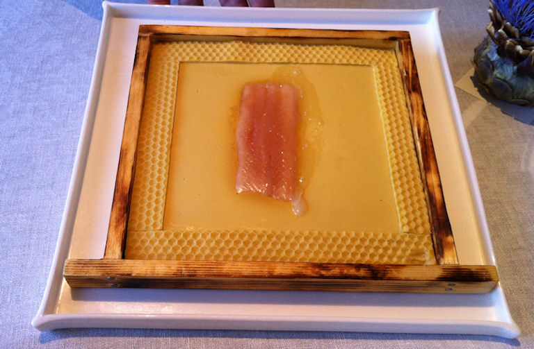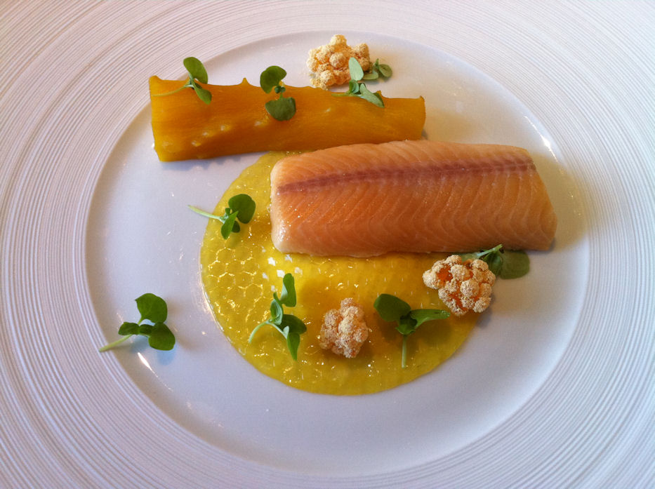 Saibling, Mariazeller Saibling im Bienenwachs mit gelber Rübe, Pollen und Rahm