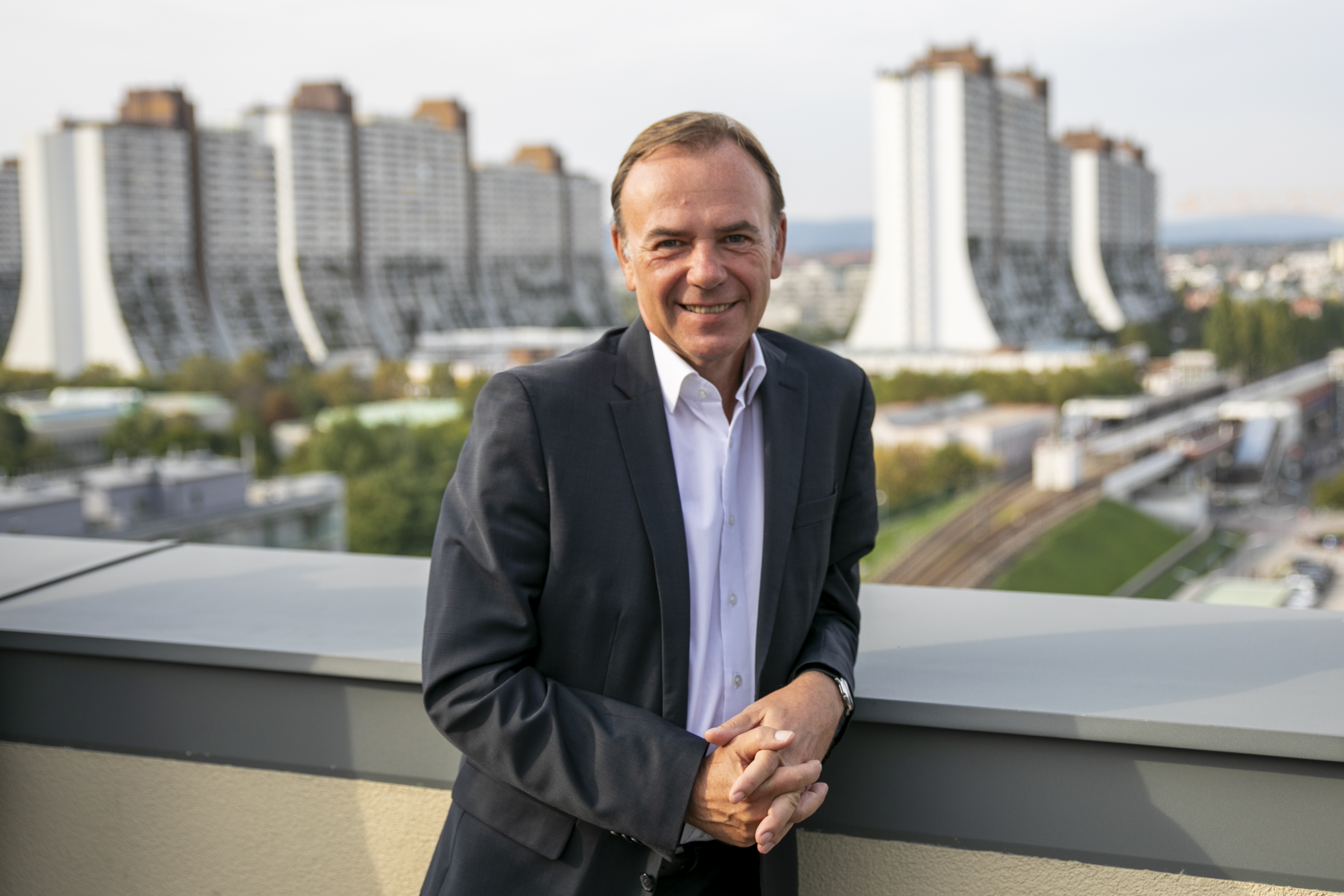 - Gerald Bischof vor den Hochhäusern