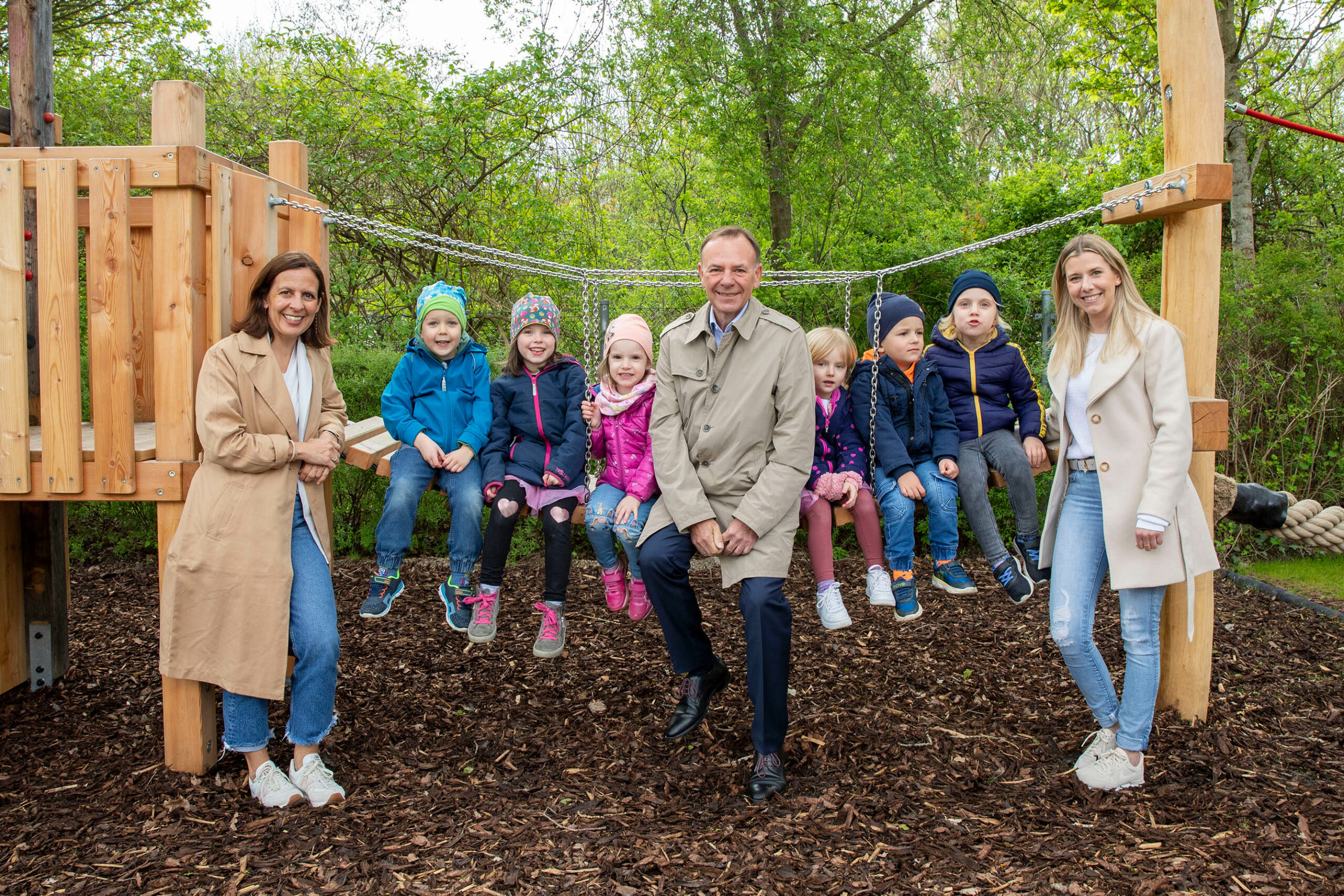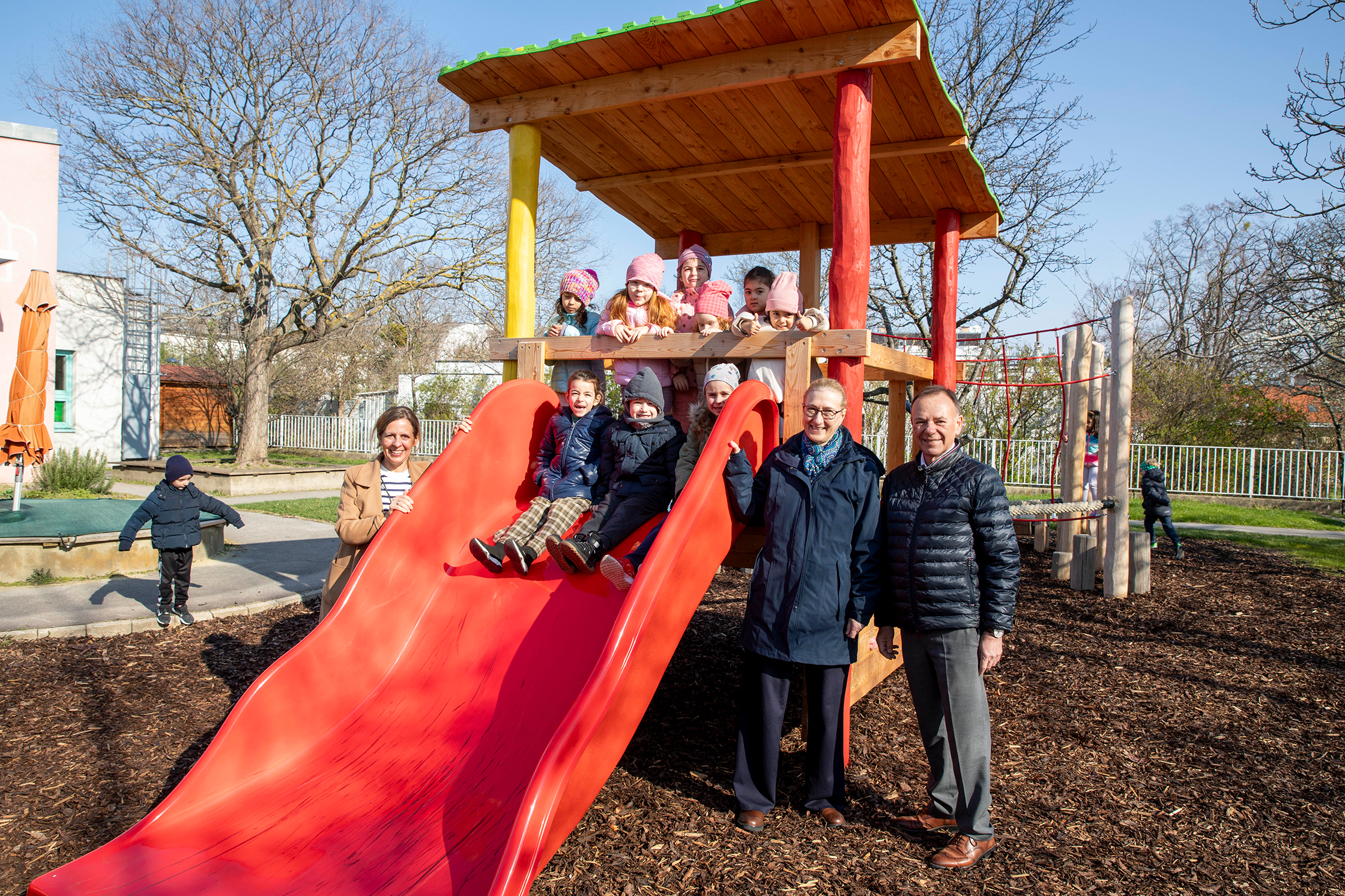 Gruppenfoto: (v.l.n.r.) Regionalleitung Susanna Obernosterer, Kids auf der Rutsche, Kindergartenleiterin Sabine Haindl und Bezirksvorsteher Gerald Bischof