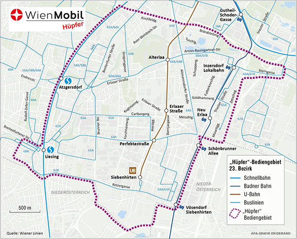 Das Einzugsgebiet wird ab 2. April auf 11km² erweitert und damit nahezu verdoppelt. Künftig wird der Hüpfer auch das Areal rund um die Stationen Siebenhirten (U6), Liesing und Atzgersdorf (beide S-Bahn) abdecken. Der elektrisch betriebene, rollstuhlgerechte Kleinbus kann künftig von 340 Haltepunkten wie gewohnt an Werktagen (Montag bis Freitag) von 07:00 bis 19:00 kostenlos via App am Smartphone gebucht werden.